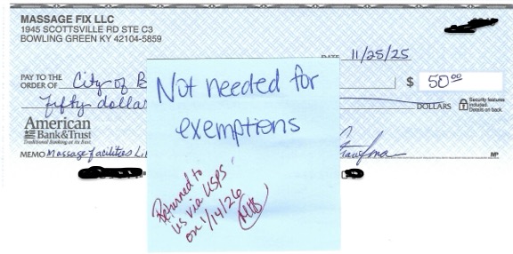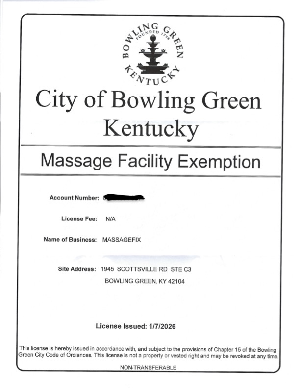 MassageFIX filed for its BG City Massage Facilities License. We did not request an exemption, and we completed the form and wrote a check for that purpose (which they returned with a blue sticky note). We were told that we would be considered âexemptâ because we are âcertified* by the state,â which means we would receive a Certificate of Exemption from the city. We did not get a choice in this matter. We have received that exempt certificate (1/14/26), and it is conspicuously posted in the lobby of our office at 1945 Scottsville Rd., Suite C3, as required by law.